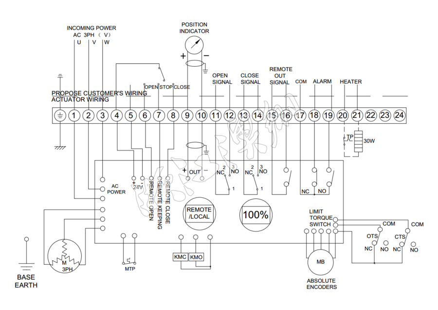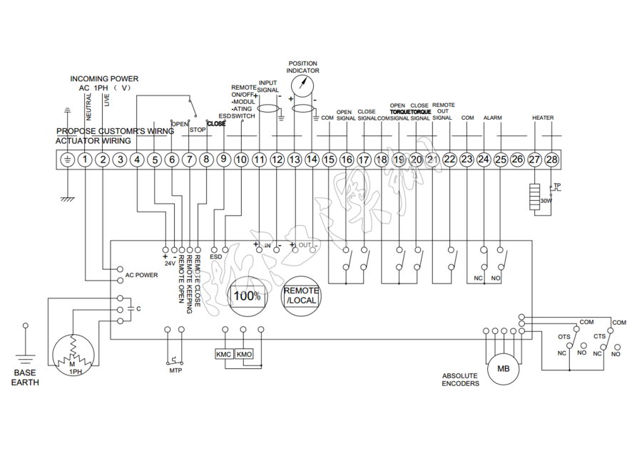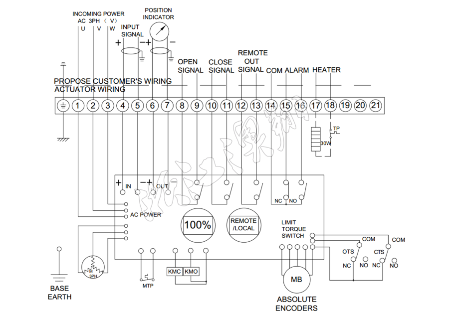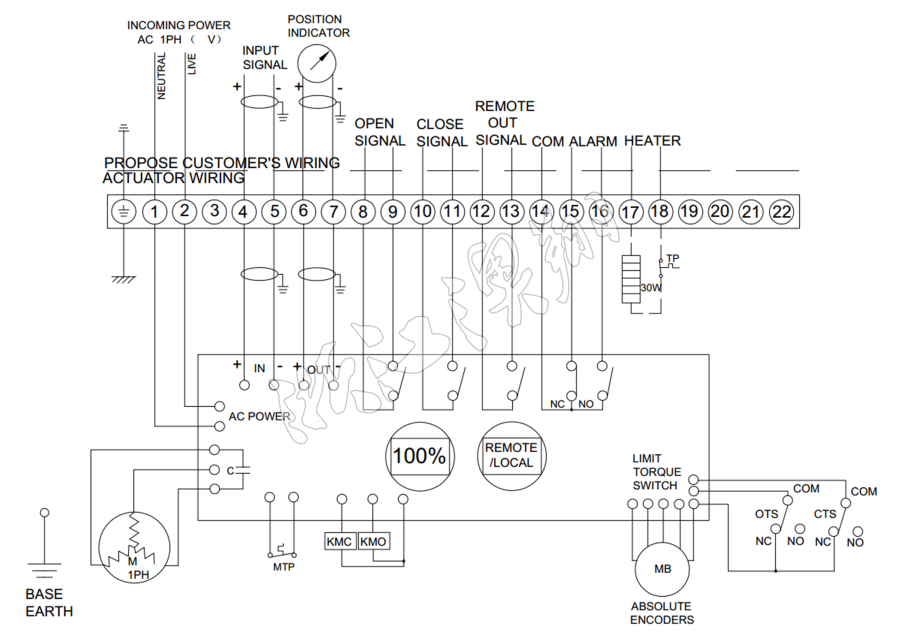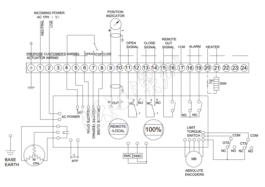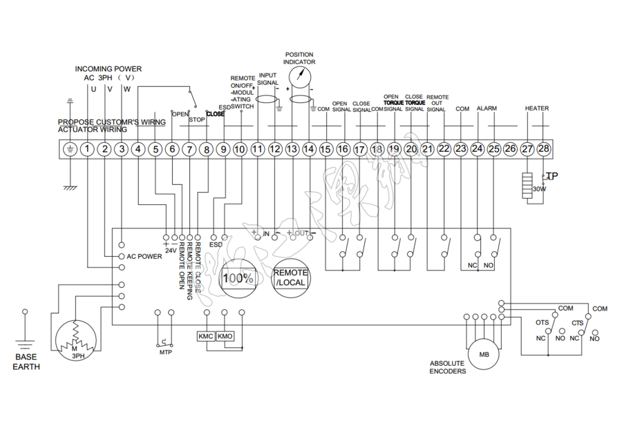 控制線路符合單相或三相電源標(biāo)準(zhǔn),線路布置緊湊合理。執(zhí)行器采用葵花端子配置29個接線端口,雙密封連接時端子臺安裝于執(zhí)行器腔體和連接器之間。即使在取下外蓋后或是電纜封套沒有完全密封的情況下,也可保護設(shè)備免于塵土或濕氣的侵害。接線端子可有Xiao滿足各種附加功能的要求。(可根據(jù)客戶要求另行加工)