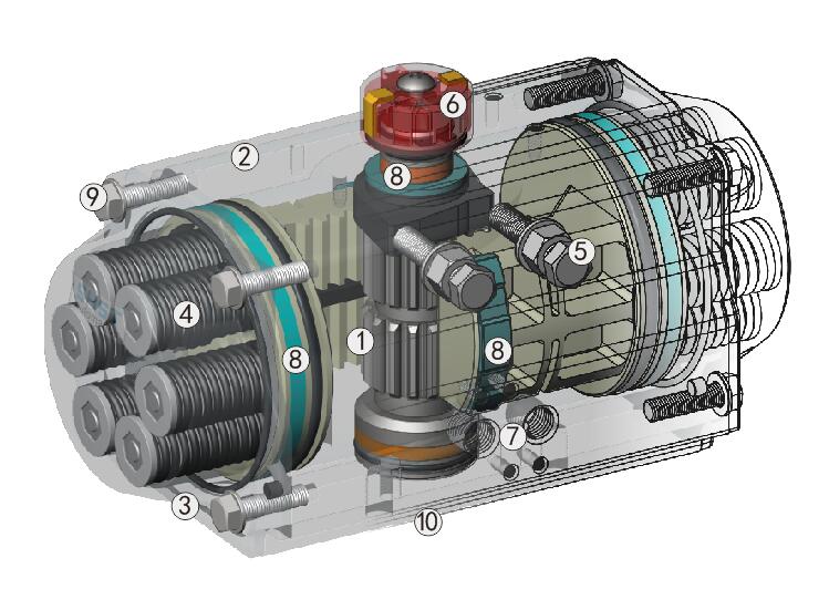 ⑧齒條背面的復合材料軸瓦和活塞導向環以及輸出軸的軸承等為防止金屬對金屬的摩擦,并且增加潤滑,使其低摩擦、長壽命。